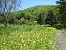 ↓登山口付近でタンポポのお花畑を歩く 標高770m付近のブナ林↑