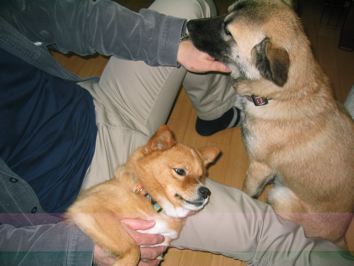 父ちゃん、お帰り〜。撫でて、撫でて〜。