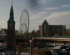 | JR倉敷駅北口からチボリ公園をのぞむ 駅とチボリ公園は、歩道橋でつながっている。 |