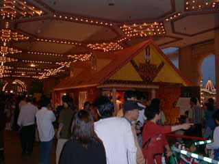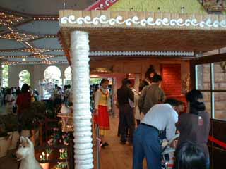 | 10月1日に、世界最大のお菓子の家「メルヘンハウス」が、登場!ギネスブックにも申請中! お菓子の家は、アンデルセンホールの1階広場にあって、高さ4.8m、間口5m、奥行き8m で、面積が12坪の家。人が中に入れるようになっており、中は、リビングルームと、ベッドルー ム。 外壁がビスケットで、屋根はビスケットとチョコレート。柱は、バームクーヘンでつくられてい る。 植木鉢の土まで、チョコレートで出来ている。窓辺のニワトリもノブもおいしそう。。。(笑) 材料は、小麦粉400kg、砂糖250kg、チョコレート200kg、牛乳30リットル・・・。これをつく ったのは、神戸のユーハイムという洋菓子メーカー。 本当に、あたり一面、あまーい香りが漂っている。でも、お菓子は、防腐加工しているので、食べられない。 子供が本当に食べてしまわないように、どういう対策がとってあるのか、とても興味があったんあだけど、室内の要所要所に、係員のお姉さんが立っていて、注意をしているだけだった。(笑)。 それから、願い事やメッセージををビスケットに書いて、お菓子の家に飾ることができる。絵馬のよ うに。願いが叶うといいね♪(850円なり) |