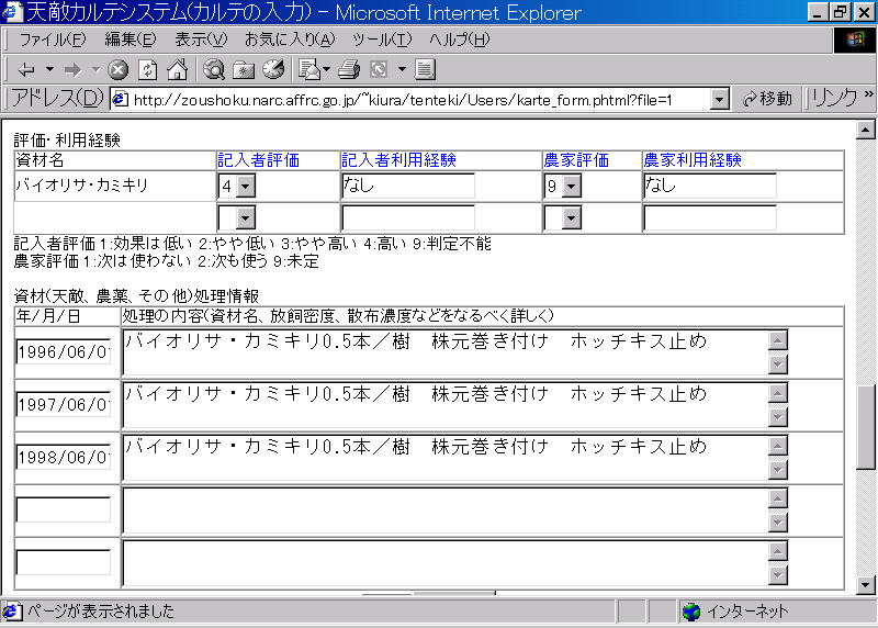 これまで入力した表の下に入力の欄が追加されています。ここに利用者の経験や評価、利用した際の条件などを記入します。資材処理情報は当初は5行分表示されてますが、複数の資材を組み合わせて使ったりしたときには、項目を追加して記入することもできます。