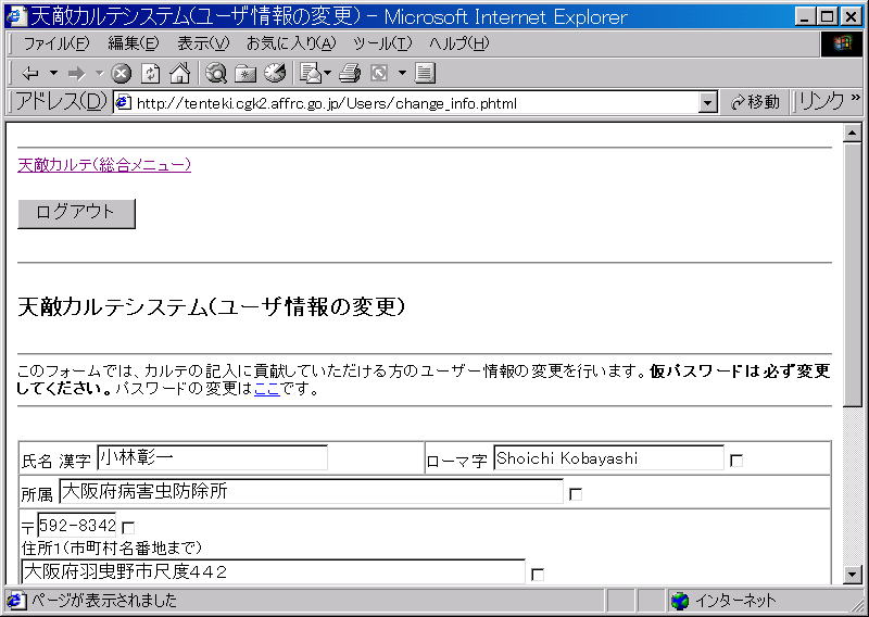 総合メニューからユーザ情報の変更をクリックすると上の画面になりユーザ情報が変更できます。異動で所属が変わったときなどに利用します。