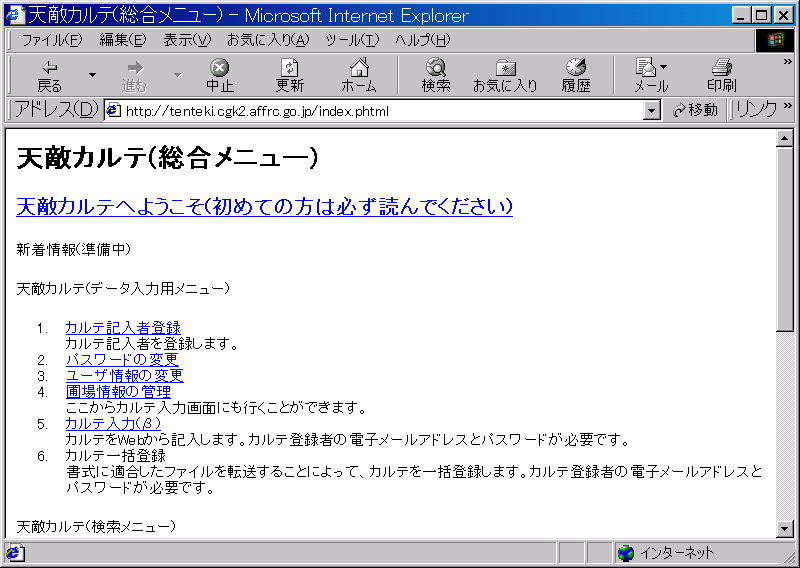天敵カルテデータベースシステムは、インターネット上のサーバーが動作しています。でホームページのアドレスはhttp://tenteki.cgk2.affrc.go.jp/index.phtmlです。ブラウザのアドレスの欄に入力すると直接移動できます。