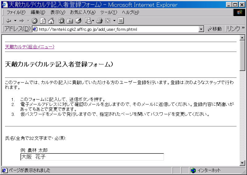 天敵カルテデータベースシステムにデータを投稿する場合にはあらかじめユーザーの登録をしなければなりません。カルテ記入者登録の部分をマウスでクリックし、天敵カルテ(カルテ記入者登録フォーム)の内容を入力し、送信ボタンを押してください。
