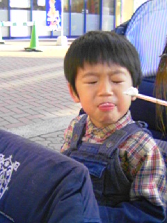 ひとしきり走り回った後、「ソフトクリーム食べたい」と言い出した私。近くのショッピングセンターへお散歩です。子供たちに付き合って走り回り、のども渇いていた私はテイクアウトのコーヒーフロート(150円!)で満足。こんなとき、普通の子供ならアイスクリームやジュースをほしがるのでしょうが、悠太と光太は全く興味がありません。コーヒーフフロートの上にのっているソフトクリームも、「冷たいもの」と知っているので「食べる?」と私が口元に持っていっても、嫌がって顔をそむけてしまいます。