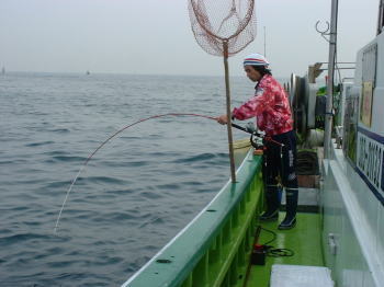 右舷側はミヨシに師匠で中に船長が竿を出して、トモに形栄丸のおばちゃん。