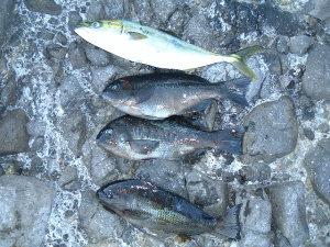 35cm〜40cmクラスの「ソーダカツオ」と「アイゴ」が多数釣れた。しかしメジナは釣れない・・・。