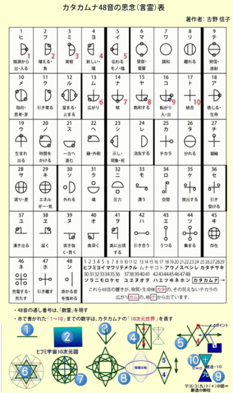 吉野信子さんの「カタカムナ48音の思念(言霊)表」もゲマトリア