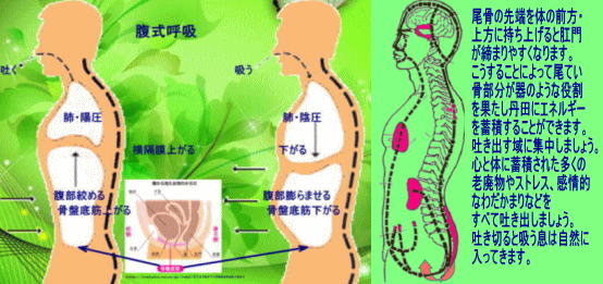 ①吸息:鼻から静かに息を吸い込む。胸一杯に肺底まで吸う。