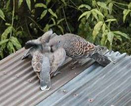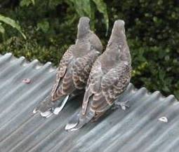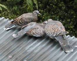 再び物干しに戻った時には、鳩の親子は我が家の1階に突き出ているトタン屋根の上に移動しており、親鳩が雛たちに餌を与えていた。