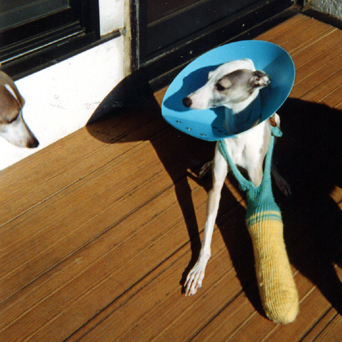 カラーはギブスを悪戯しないようにと付けてあったのだが、カバーでギブスを完全に覆ってしまったので齧られる心配あるまいと油断し、一緒にいる時くらいはこの邪魔なものを外してやろうと浅はかな情けをかけたのが運のツキ。まぁ確かにギブスは齧られていなかったけどね。