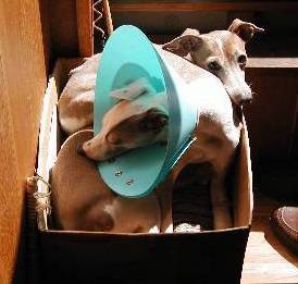 ホールされるとか、カラーの先端で顔やら身体やらを思い切りつつかれるとか)に耐えかね、ついには完全にホームズを避けるようになってしまった。凶器のひとつであるギブスが取れたとはいえ、傷口に巻かれた包帯を食いちぎらないよう、もうひとつの凶器たるカラーは今もってバリバリの現役だし。