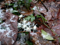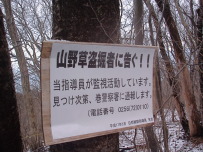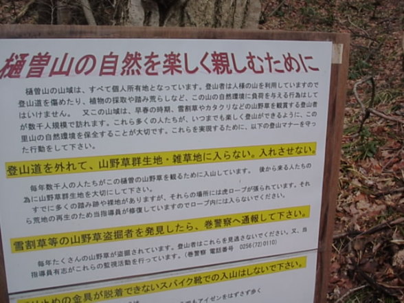 弥彦山系で春が一番早い花の園 人にはあまり知られたく無いのだが。 弥彦スカイライン間瀬側から登山する。1年前、本紹介され て以来、ハイカーが一気に増えたところ。 困った事に山野草の盗掘が急増し、案内標識が外され 代わりに、盗掘禁止はもちろん、シートを広げての休憩、 登山用ストック、スパイク長靴の禁止等細かに書かれている。 山頂標識も撤去されている(友人談) H18.3.2 |