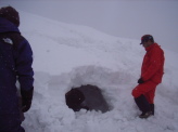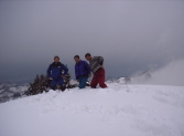 | 9:58 山頂のはず? | 雪洞で風をしのぐ | 12:00 晴れ間に記念撮影 | 1:40 姥清水口 | |
