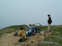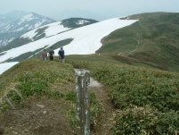 | 片道4時間の行程は久しぶりにハードであった。 残雪を想定し長靴を使用したがあまり活躍しなかった。 越後三山の眺めもうっすらと雲霞が有り間近に感ずるこ とが出来ず残念だった。花も主役のニッコウキスゲはまだ。 ハクサンコザクラが2・3輪咲いていたていどだった。 花は少なくとも、壮大な草原の山頂は魅力の山の1つで した。