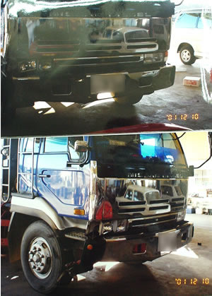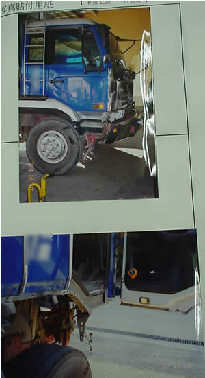 ダンプは右の角が一番壊れています。割れたヘッドランプが固まりで二個当方の車両に飛び込み助手席の同乗者の左頭部を直撃し私の左こめかみのあたりに当たりました。衝突後停止した車両を移動する時ダンプのバンパーが当方車両前のドアに食込み直径15cm程の穴が空いていました。当方は全損で左側面 屋根がひしゃげて後部車輪が斜に押し込まれていました。ダンプは修理代金57万円程かかったそうで、写真ではあまり壊れているようにはみえませんね!