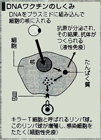 「DNAワクチン」は、病原体そのものではない点は、抗原部分を精製した不活化ワクチンに似ている。しかも、細胞の中に入り込んで、細胞性免疫で感染細胞をたたくときにカギとなる目印をつくらせる働きがある。 この日印を覚え込んだキラーT細胞が増殖して、体内の感染細胞を攻撃してくれる。
