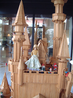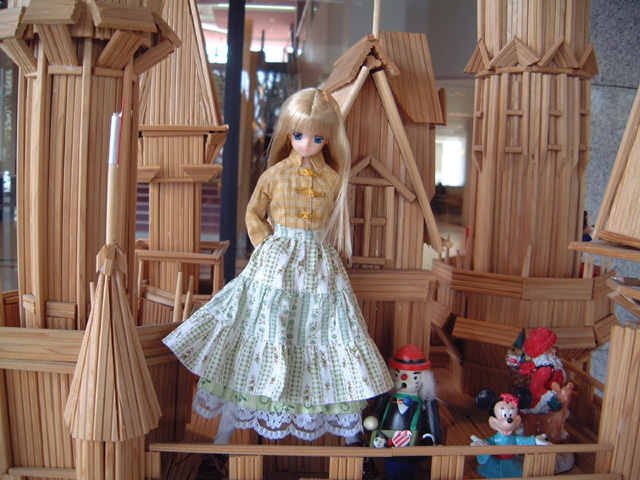 思わぬところでお城に出会いました。温泉自体には入れませんでしたが、温泉のある施設はかなり大きなモノなので、下見がてら探索していたのです。裏口から入って食堂、喫茶室、休憩室などなどを見て、正面入り口から帰ろうと思ったとき、施設内のレストランで使われた割り箸を組み合わせて作ったというこのお城があったのです。まわりをキョロキョロと見ながらサアラさんに出てきてもらっての一葉なのでした。