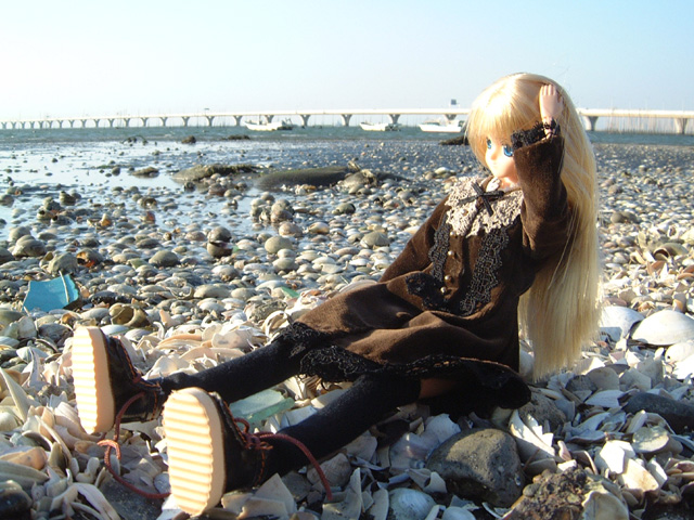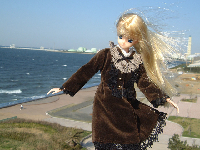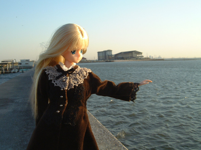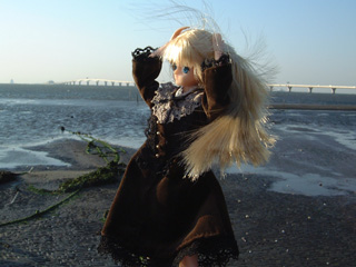 今日は本当に凄い風だったのっ。砂浜まで降りたのだけれど、波はざぶ〜んって寄ってくるし大変だったわ。それに聞いて聞いて!この撮影のあと、よるるんったら車に戻ろうとしたら降りてきた防波堤が滑って登れなくなっちゃってるの!困ってうろうろしているうちに靴の中まで海水が入るし、私を入れているケースを落とすし、滑ってひっくりかえるしでみっともなかったなぁ。15分くらい、堤防沿いに歩いてやっと上がれたけど・・・まぁ、怪我がなくてよかった。車に戻ってから笑って私の髪の毛、整えてたし・・・大丈夫なんでしょ。たぶん。きっと。