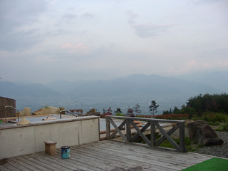 もうねー。女湯側の壁、後ろの脱衣場を除いて二方向が開放されている。写真に写っている湯殿が一番高い位置なので、もー絶景。晴れていれば前方の山々に富士山も見えるらしい。また、写真の檜の湯殿のすぐ下には岩風呂がある。最高。