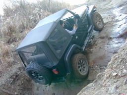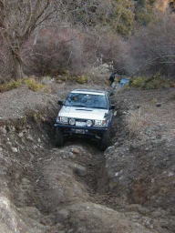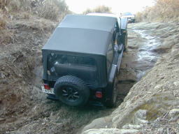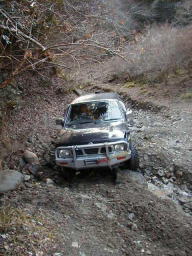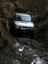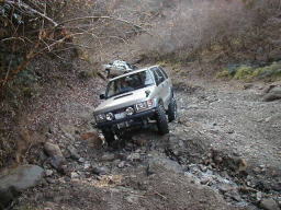 最後の岩盤の壁で立ち往生。 前脚を掛けるとこまでは上がりますが、壁に張り付いた状態でどうしようもなくなります。 上手いアンカーも見つけられず、止む無くしまさんに上に回ってもらいアンカーとなってもらいました。 しかし、この位置まで235のGEO/MTできっちり上がれたのは、やはりエアロッカのお陰です。(^^) |