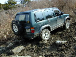 やってくれました。(^^) しかもさっきよりも高さがあります。(画像では判りにくいですね) これはアンコールに応えるべく、この位置で左リアタイヤを岩に当て、車体を静止させるという、計算され尽くされた走り(のはず)です。(^^;; |