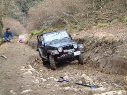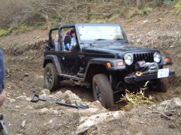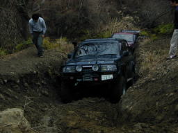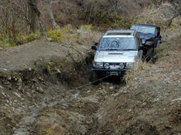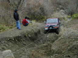 オノズの終点。 この前にすでに、もじさんをウィンチングで引きずり上げました。 いい位置にアンカーがなく、遠い位置の木をアンカーに、補助ワイヤー+地面支点アンカーをとり、シングルで引き上げ。 途中、電圧低下などマイナートラブルはありましたが無事登頂しました。 もじさんには、このあと全車のためにアンカーになってもらいました。m(_ _)m 画像はあらじん号。 かなり轍が深くなっており、前々日の雨でグリップせずで、この位置から止む無くウィンチング。 |