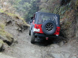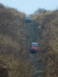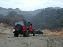 常道坂を下る、赤TJ&ビグロン。 なかなか雰囲気ある画像でしょ? 今回の私のお気に入り画像その1です。(^^) |