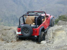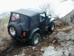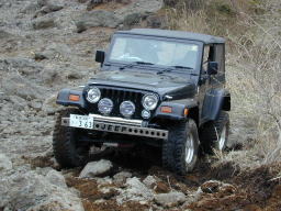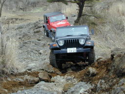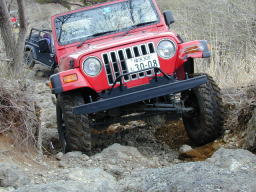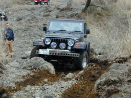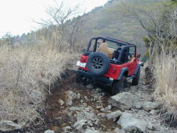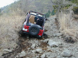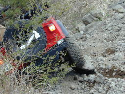 後続が次々と来るので、車輌移動中のみずかみさん。 岩を抱えて、よろしくない方向にずるずると、、、 最後は抱えた岩を踏み越えちゃう状態になり、びみょ〜な態勢に。 念のため、私のウィンチでサイドを確保しましたが、全然どうってことなくクリヤしました。 |