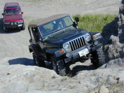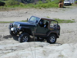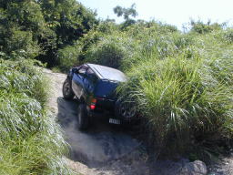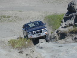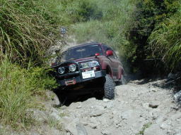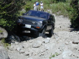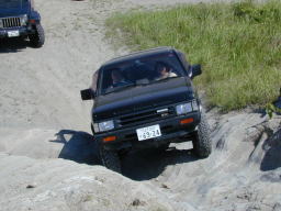 続いて、パッと見ノーマルのす〜@D21テラノVG30Eさん。 なんか、ヒョコヒョコと登って行きました。 聞いてみるとやはり、前後入っているそうで、偽テラノ仕様でした。(^^; でも、前後入れてる以外は、まったくのノーマルで、タイヤも235だそうです。 この後、前後入ってない(^^;、ひらぬまさんもちゃっかり登りました。お見事! |