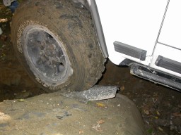 仕切りなおしている時、岩とタイヤに泥除けを挟んでしまい、自分の駆動力で引きちぎってしまいました。 |