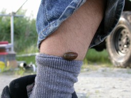 楽しかったLast F2もタイムオーバーとなり、広場で撤収作業。 案の定、みしまさんの足首にはまるまる太ったヒルが、、、 「F2名物ヒルもこれで見納めか、、、」と、満腹間近のヒルを撮影。(^^; |
