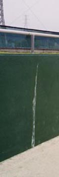 の小さな穴は「ピーコン」とか「セパ穴」と呼ばれているもので、コンクリートを固める際の型枠を固定するために必要となる出っ張りの跡のようです。白い線は、アルカリ骨材反応によるものではなく、「遊離石灰」ではないかとのお話でした。「遊離石灰」は、コンクリートに必要以上に加水したような場合によく起こる現象だそうです。素人判断で誤った情報をお伝えしたかもしれませんが、悪しからず。ただ、テニスをやっていた日曜日に、背広を着た人が10人以上この辺りを調べに来ていたことから、これがなんらかの問題となっていたのは確かのようでした。