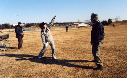 野川公園と200mほどしか離れていない場所にも、「武蔵野の森公園」というかなり大きな公園があります。この公園は調布飛行場に隣接しているため、飛行機見物も可能です。園内の大芝生広場では、紙飛行機を飛ばしているおじさん・おばさんのグループがいました。下の写真の左側のおじさんの頭の上を飛んでいるのは、調布飛行場に着陸しようとしている本物の飛行機です。
