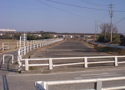 愛知環状鉄道の下をくぐり、右に曲がりしばらく行くと、用水の表面は見えなくなる。 このように、用水の表面はコンクリートでふたをされてしまう。 コンクリートの地肌がむき出しのまま。 左右の道路を結ぶ橋はあるが、水が見えない橋である。 |