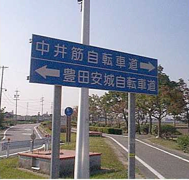 ここから、明治用水は東井筋と中井筋に別れる 右側の中井筋は名鉄西尾線、JR・新幹線の三河安城駅 を横切り、刈谷の方に延びている 左側が東井筋で、安城から西尾に延びている 看板には 「中井筋自転車道」、 「豊田安城自転車道」と書かれている この周辺は水田地帯で、名鉄本線のちょうど南側になります