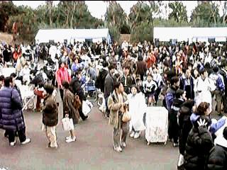 11時には開場。入り口では横浜フリューゲルスの試合にいくと「たまごっち」があたるというチラシを配っていました。トレーニングセンターの建物横の駐車場にテントが張られており、中では選手&スタッフの皆さんが色々な料理を作っています。