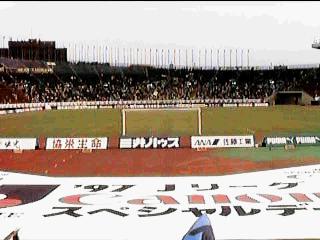 もう一つ、この日はエヴァンゲリオンのポスターがもれなくもらえたのですが、出口に大勢の???な人達があふれていて「ポスター買います」とか「テレカ1万円で買います」とかいっていました。すごい人気なのですね>エヴァンゲリオン。そのせいかどうかはわかりませんが、国立に約2万4千人が入りました(イベントがらみで入ったみたいに思われるのが、サッカーファンとしてはちょっと悔しい)。