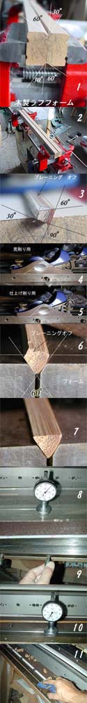 セットしカンナがけをして所定の寸法にする工程ですが、竹片の断面は四角形・・・フォームの溝につけられた角度