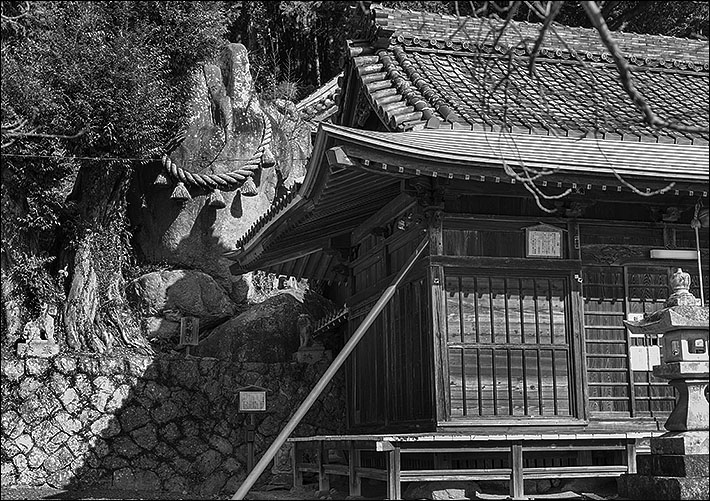 社殿の左側、背後に広がる社叢のふちとなる石垣の上に、極太の注連縄を巻かれた高さ約5mの巨石「岩神様」がそびえ立っている。真下から見上げるその姿は、ご神体としての圧倒的な存在感を放っている。