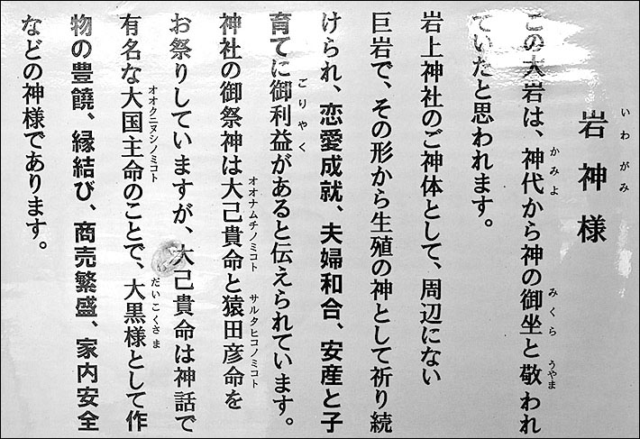 たしかに岩神様の特異な形状は、宝珠形に似ているが、一方で、岩神様は古くから男性器の形をした「陽石(男根を模した石棒など)」として祀られていたようだ。境内の案内板にも、岩神様は「その形から生殖の神として祈り続けられ」たとあり、恋愛成就、夫婦和合、安産と子育てに御利益があると記されている。