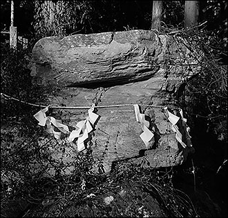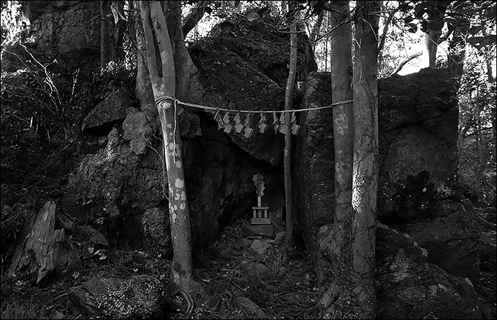 一方の、岩が重なり合ってできた岩陰には、2本の立ち木を利用した注連縄に、赤い紙垂(しで、注連縄や玉串・幣串などに付けて垂らす紙)が付けられており、岩陰の中に、赤い御幣(ごへい)が置かれている。