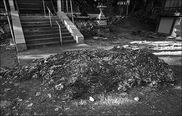 道路沿いの明神鳥居の左に、注連縄が張られた石がある。由緒は記されていないが、これも神道における霊石の類ではないだろうか。また、石段を上っていった拝殿前の平地にも、地面から岩塊(写真下)の露頭が見られる。岩の表面に苔が付着しており、岩質を見分ける自信はないが、秩父・長瀞の岩畳で知られる緑色片岩のように思われる。