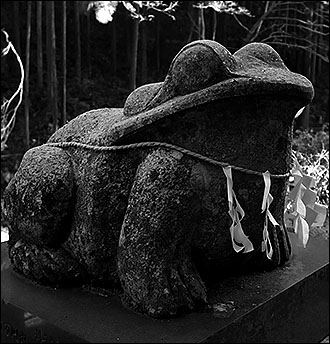 狛犬ならぬ「狛ガエル」が鎮座している。