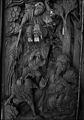 鞍馬山「牛若丸の修行場」が彫られた拝殿の脇障子。