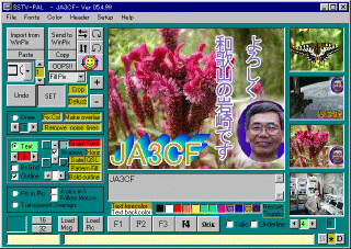 「SSTV-PAL」は前項で書いたようにSSTV編集用に作成されたソフトですのでたいへんよくできています。漢字も入力できますしフォントもいろいろ選択ができます。それにあらかじめ送信用に作っておいた画像も簡単に呼び出せます。書き間違った文字の変更も楽に出きるのが便利です。しかし文字の確定には「SET」を押すことが必要で、使い慣れるまで戸惑うことがしばしばあります。