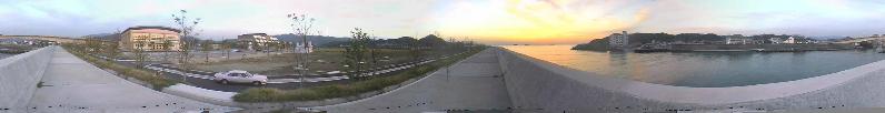 PhotoVistaを使ってパノラマ画像を作ってみました。思ったより簡単で3回目の試作でこのように仕上がりました。この画像は我がタウン広川町の夕暮れを撮ったもので、ビデオカメラで写してきたのを8枚のショットにして繋ぎました。 最初の試作では、一部でうまく繋がらなかったのですが、その部分を手作業で修正し大きさを変更したのがこの映像です。初めての画像としては我ながらよくできたと満足しています。 車の後ろに写っているのが昨年完成した広川町の庁舎で、その左側にある大きな建物が4月にできたばかりの体育館です。そのまた左側の堤防の後ろに弓なりになっている橋は「なぎ大橋」で、広川町と北側にある湯浅町の間に架かっています。 ビデオの画像ですが、インターネット用には十分実用になります(138KB)。デジカメで入力すると、もっと鮮明な画像を作成することができますが、データ量も大きくなります。なかなか面白いソフトなので、当分はこれにはまりそうです。(画像をクリックすると拡大表示) 近くオーストラリアに行く予定ですので、シドニーの有名なベイブリッジやオペラハウスなどを撮ってきます。乞うご期待!
