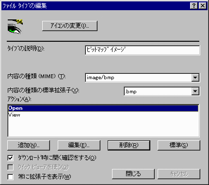 ではこのBMPを例にとってこの画像のソフトを登録してみましょう。「編集」をクリックすると、「ファイルタイプの編集」画面になります。ここにを参考にしてそれぞれの項目の書き込みをします。BMPの拡張子が登録されていないときは、追加をクリックして同じように書き込みます。