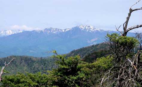 小丸山から東方を望む 左から皇海山、鋸山、 遠く日光白根山、庚申山、 アカヤシオ、男体山、備前楯山