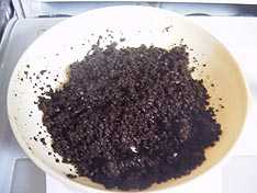 「おいおい、これから作業をするってのに、いきなりコーヒーブレイクしてどうすんだい」って? ![]() そうです、我が家の秘密兵器(?)は“コーヒーかす”なのです。ちなみにこれはブルーマウンテン6杯ぶんのかす。でもコーヒーの銘柄は問いませんよ〜(^^ゞ |